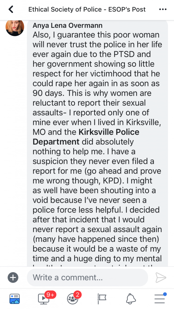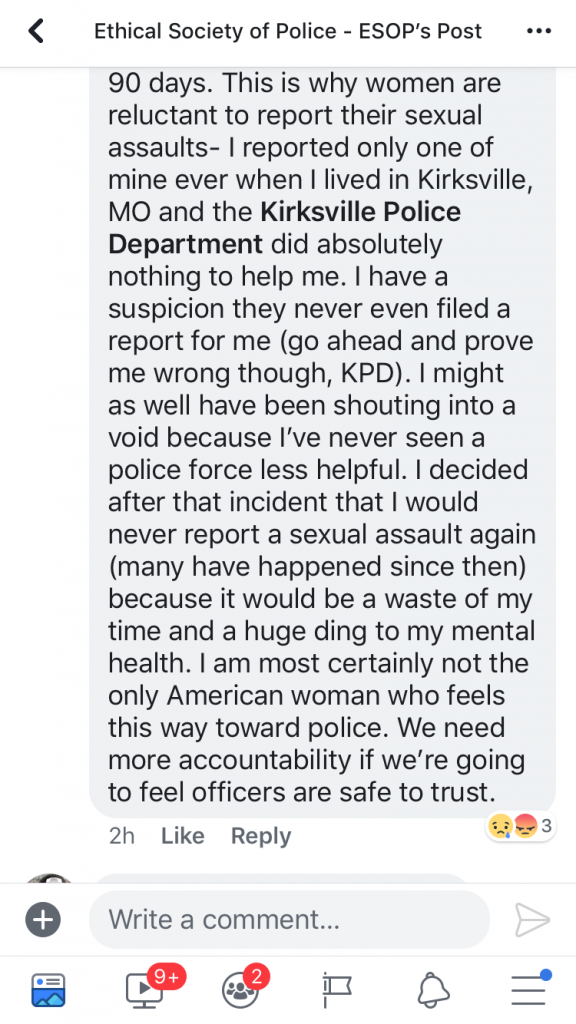 Then, one morning recently, I was scrolling through my Facebook feed when I came across this article shared by the Ethical Society of Police about a woman who was raped by a Colorado police officer, and then the officer was only sentenced to 90 days in jail. Maybe it was because I woke up in a particularly fiery mood and that article provided the flint to spark the fire in me, but that morning I decided to have it out with the Kirksville Police Department. I sought to address the similarities in lack of accountability amongst police forces regarding sexual assault cases.