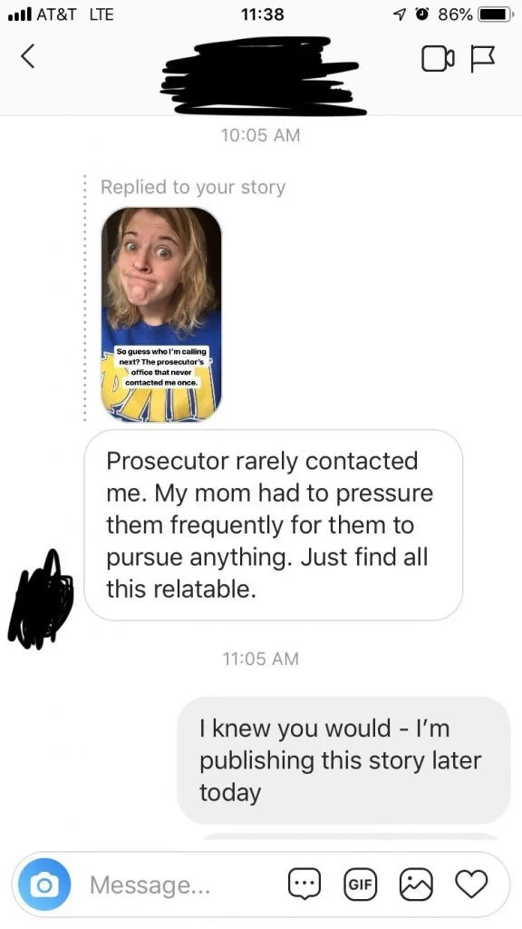 My message to Kirksville Police & Prosecuting Authorities: The way you handled my case, by your own admission, made no sense. It took five years, and it could’ve been five more if I hadn’t decided to take action when I did. The people you serve should not have to reach out to you to make sure you’re doing your job. You are paid to ensure citizens are safe and laws are enforced, but we as citizens suffer and lose trust in you when you can’t do your job properly.